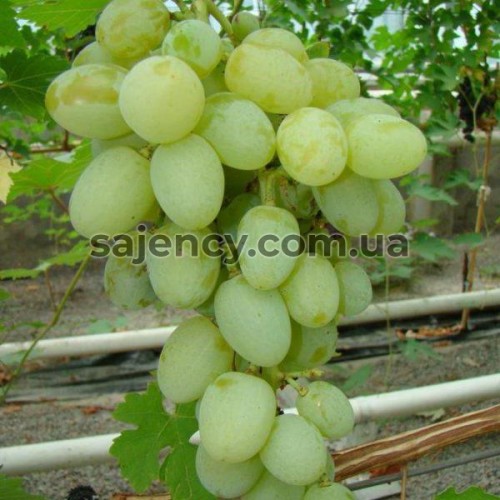 Грона дуже великі, конічної або циліндричної форми, середньої щільності, вагою від 700 г до 1,5 кг. Ягоди овальні або яйцеподібні, масою 12–18 г, золотисто-жовтого кольору із сонячним засмаженням. Шкірка тонка, але міцна, м’якоть соковита, м’ясиста, з приємним гармонійним смаком, у стадії повного дозрівання з’являється легкий мускатний аромат.